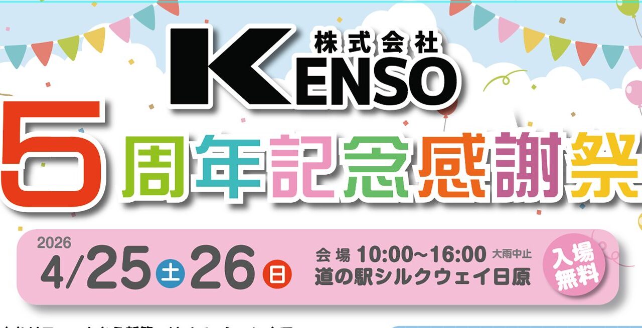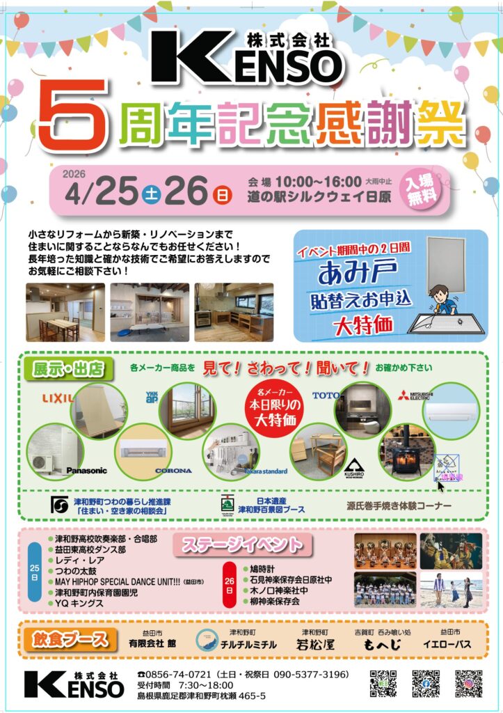 津和野町を中心に、新築・リフォームを展開する株式会社KENSOの5周年記念感謝祭が、2026年4月25日(土)・26日(日)で行われます。